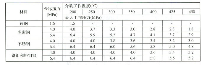 調節閥、管子及管路附件的公稱壓力、工作壓力、使用溫度的關系見表一