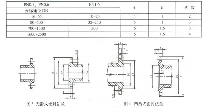 公稱壓力PNO.1、PNO.6, PN 1.6的調節閥法蘭采用光滑式.與之配用的法蘭也為光滑式,密封型式見圖3及表4.